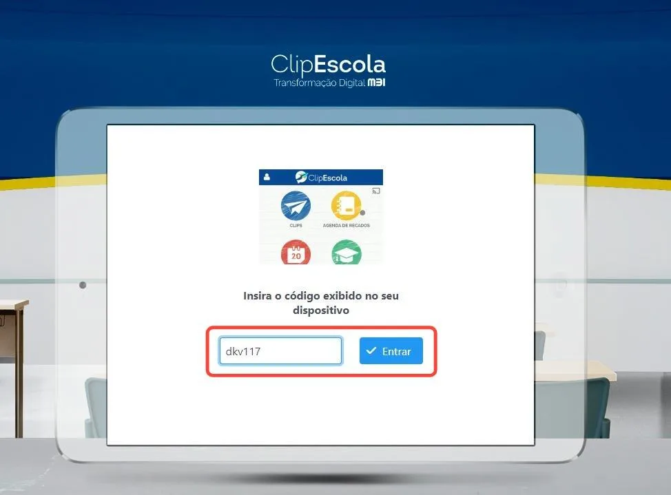 Acesse o site viewer.clipescola.com e digite o código no campo, assim como no exemplo. Depois, clique no botão “Entrar”.