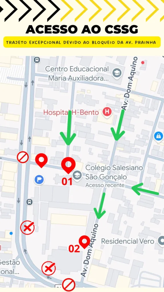 1. Acesso pela entrada da Av. Dom Bosco – Vindo pela Rua Dom Aquino, Comendador Henrique (lateral do CEMA), Rua Joaquim Leite de Figueiredo (atrás do HBento), chegando na Dom Bosco e seguindo à esquerda como de costume.